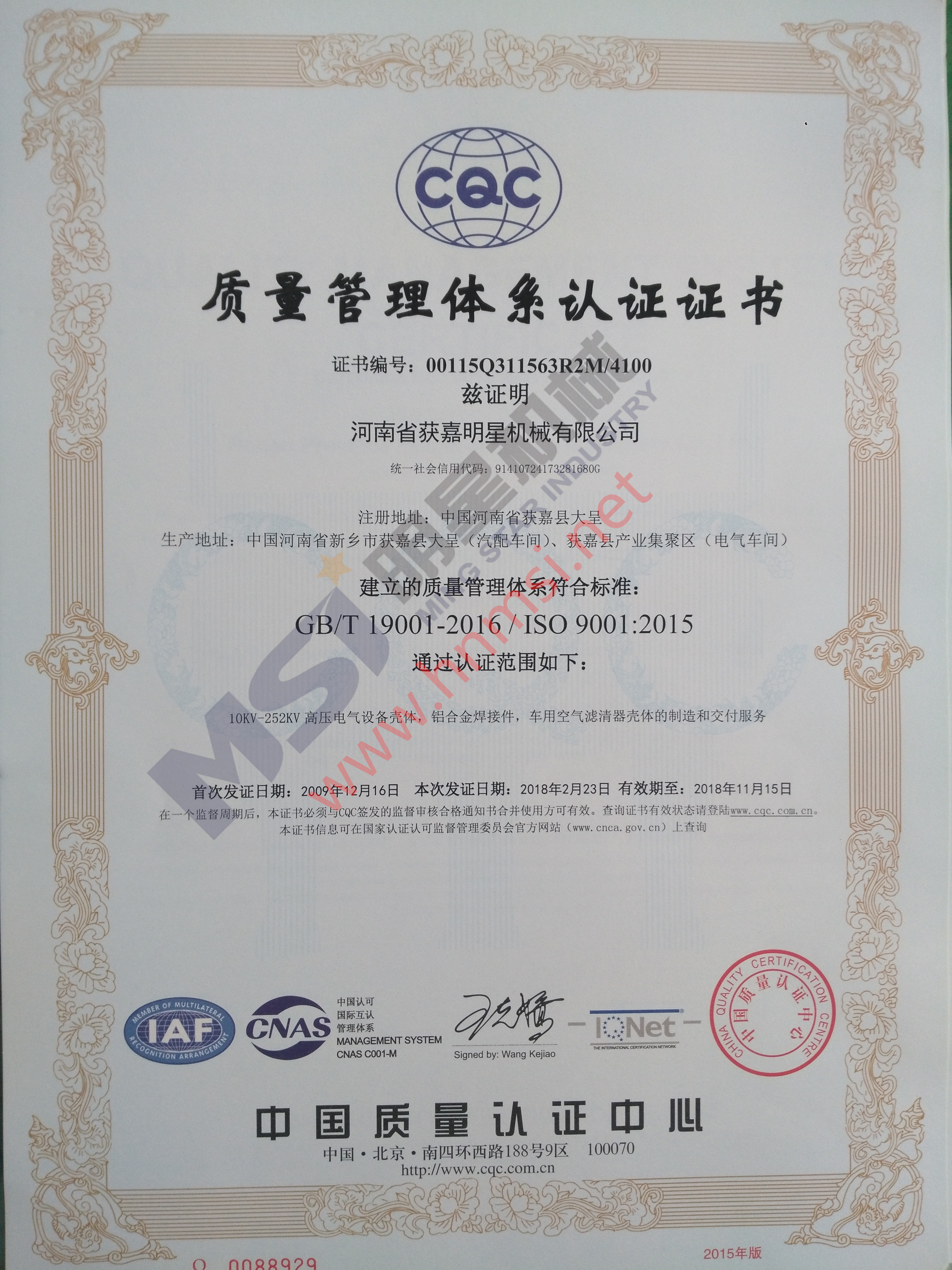 日前,經(jīng)過中國質(zhì)量認證中心**、嚴格、細致的審核,明星機械質(zhì)量管理體系成功實現(xiàn)了由ISO9001:2008向ISO9001:2015的轉版審核。此次通過認證的范圍是:高壓電氣設備殼體,鋁合金焊接件,濾清器殼體的制造和交付服務。